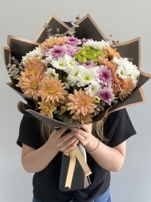 Yaklaşık 65 cm yüksekliğinde buket, mevsimin en taze renkli papatyaları ile hazırlanmaktadır.